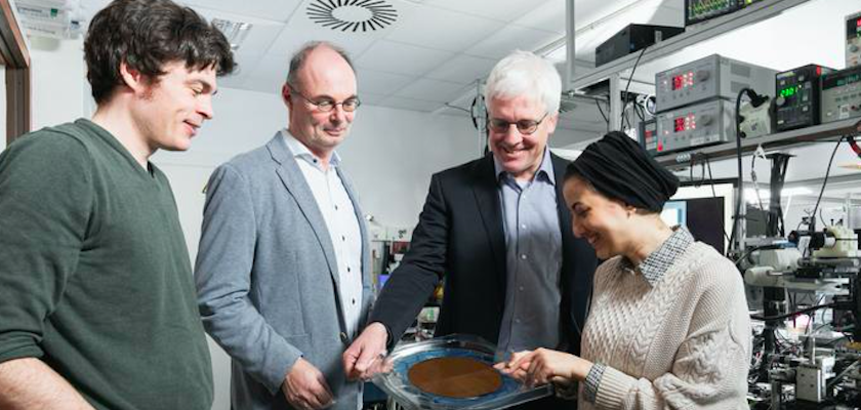ERC Synergy Grant for the ATHENS project team. From left: Adrian Schwarzenberger, Professor Stefan Bräse, Professor Christian Koos, Hend Kholeif (Image: Amadeus Bramsiepe, KIT)