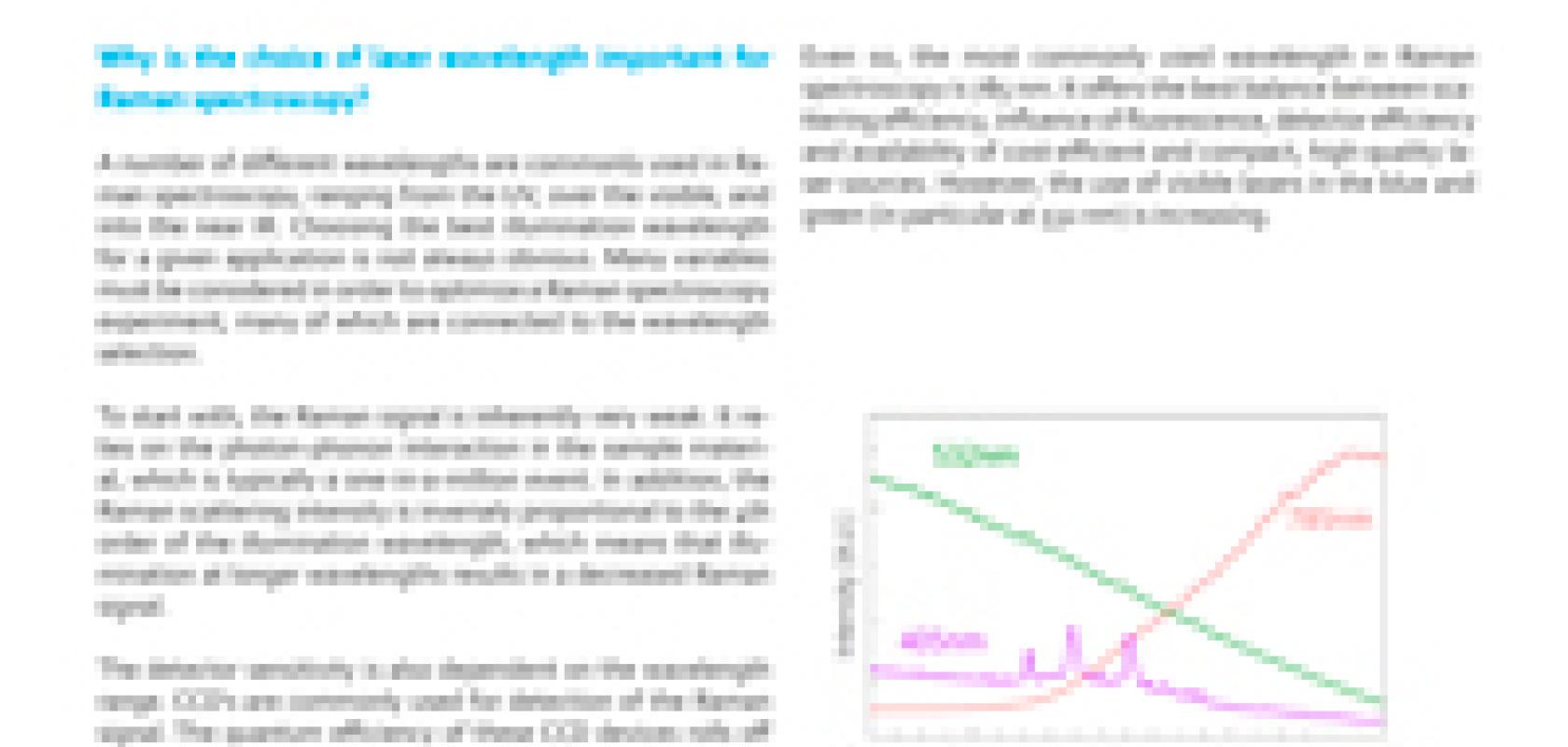 Thanks to rapid technology advancements in recent years, Raman spectroscopy has become a routine, cost-efficient, and much appreciated analytical tool with applications in material science and in-line process control for pharmaceutical, food & beverage, chemical and agricultural industries. Improvements in laser technology, detectors (CCDs and InGaAs arrays), and spectral filters (VBG-based notch filters), along with developments of new schemes for signal generation and detection, have aided Raman instrument manufacturers in overcoming the challenge of weak signals which has accelerated instrument development and market growth. In this white paper, we discuss important performance parameters to consider when selecting a laser for Raman spectroscopy experiments.
