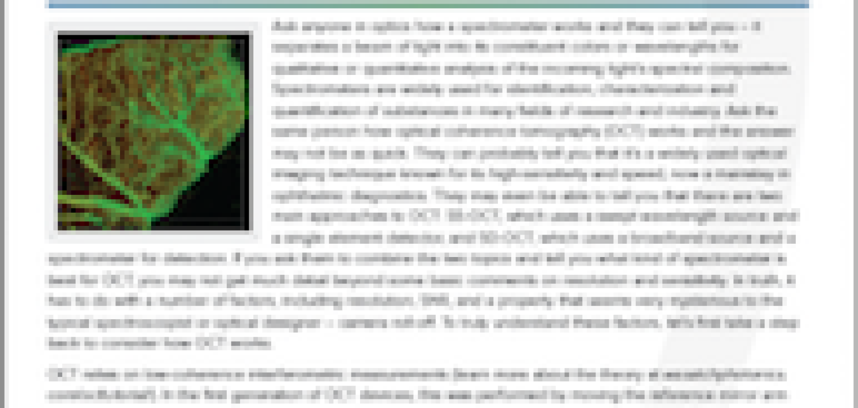 Does building your own OCT spectrometer really get you the clearest image? Creating a high-performance spectrometer for SD-OCT imaging requires a deep understanding of the finer points of both OCT theory and spectrometer design. In this tech note, we'll explain the most important parameters and contributors, then model the best available off-the-shelf lenses vs custom-designed optics to see just how the two compare. The difference in performance will surprise you…